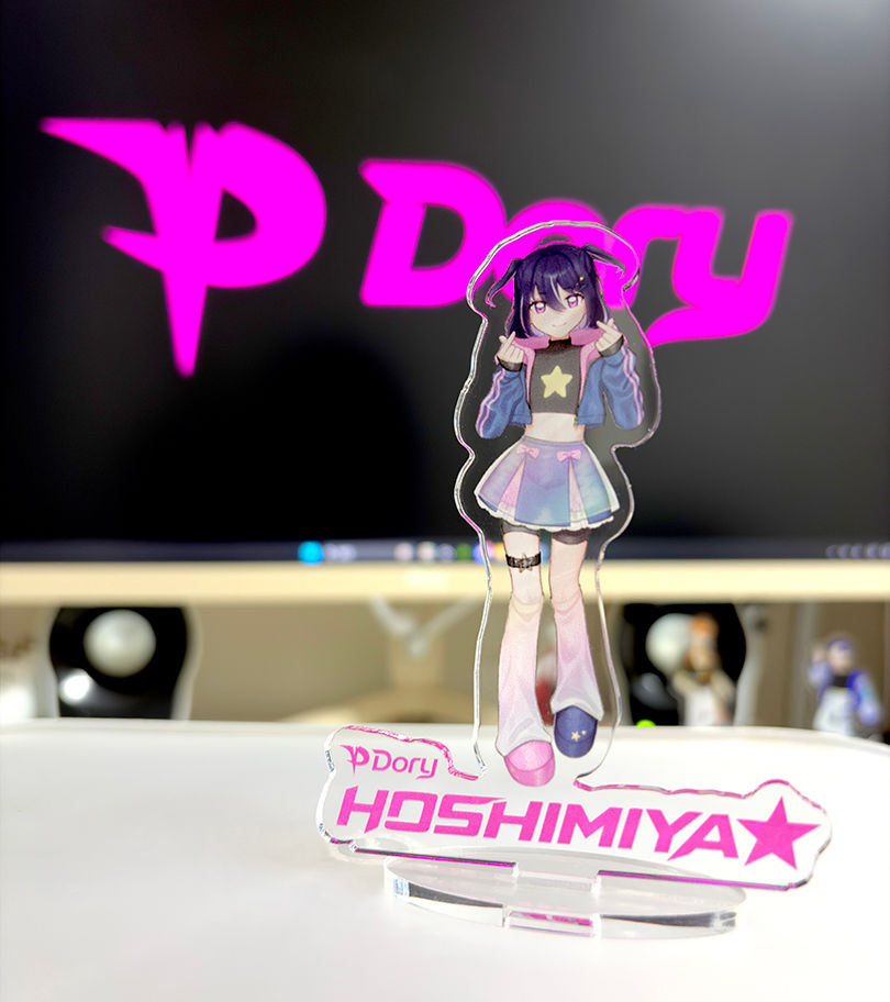 Dory所属のほしみやをそのまま手元に置けるアクリルスタンドです。立体感のある加工で、応援している姿勢をより身近に感じられます。机や棚、ゲーム環境の一角に飾るだけで、気持ちが引き締まります。観戦時の相棒にも、自宅でのモチベーションアップにも使えるアイテムです。